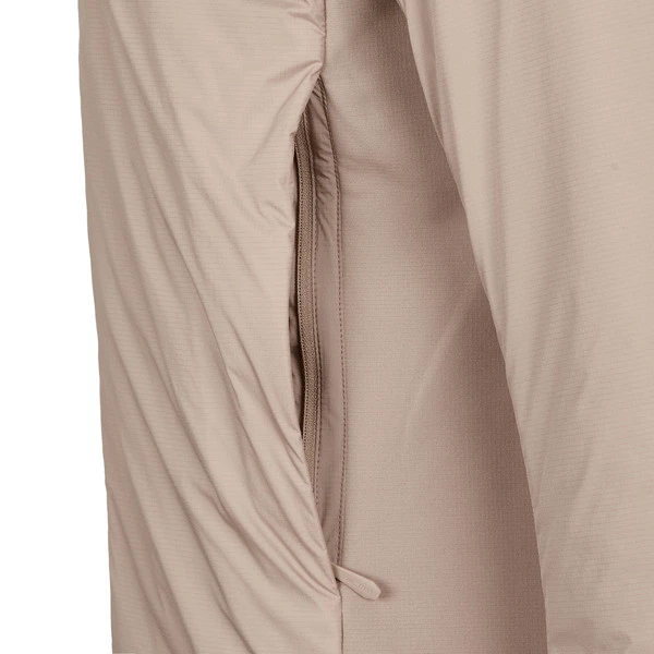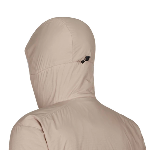 Außen kommt ein imprägniertes, abriebfestes, windabweisendes Nylon zum Einsatz, das für leichten Wetterschutz sorgt. So kann leichter Nieselregen eine Weile abperlen. Dank seitlichen Stretchfleece-Einsätzen wird ein Überhitzen verhindert und der Trägerin mehr Bewegungsfreiheit verschafft. Die Materialien sind glatt in ihrer Oberfläche, damit dir das Schichten unter und über die Jacke leicht von der Hand geht. Dezente Bündchen und eine flexible, weiche StormHood Kapuze passen mit deinen Bekleidungsschichten zusammen, ohne Falten zu schlagen.