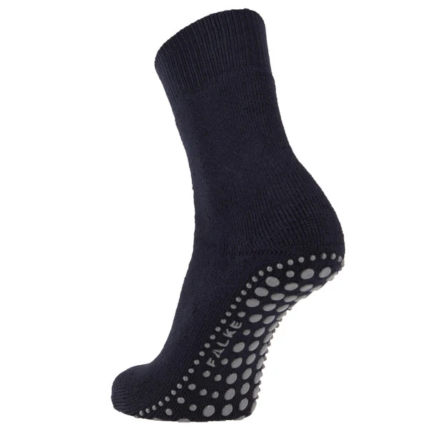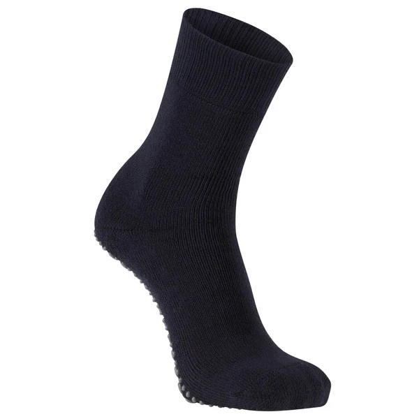 Dickes Wollgemisch, innen in groben Schlingen gearbeitet, legt sich wunderbar wärmend um den Fuß. Unterwärts sorgen Gumminoppen für Halt auf glatten Böden.
