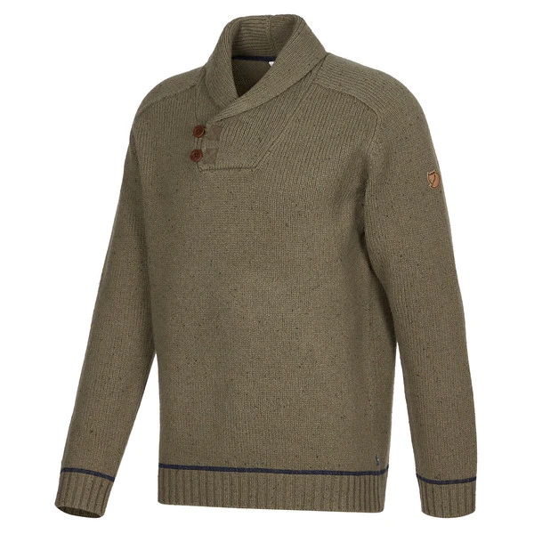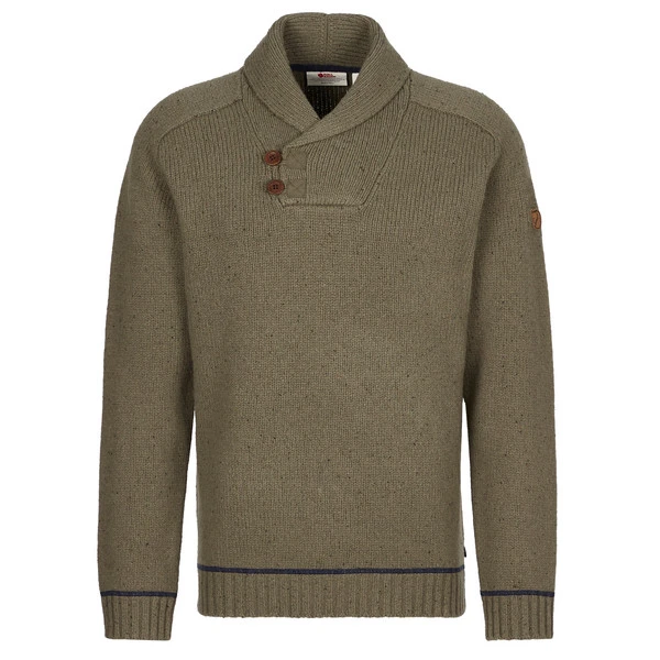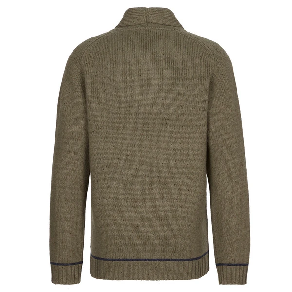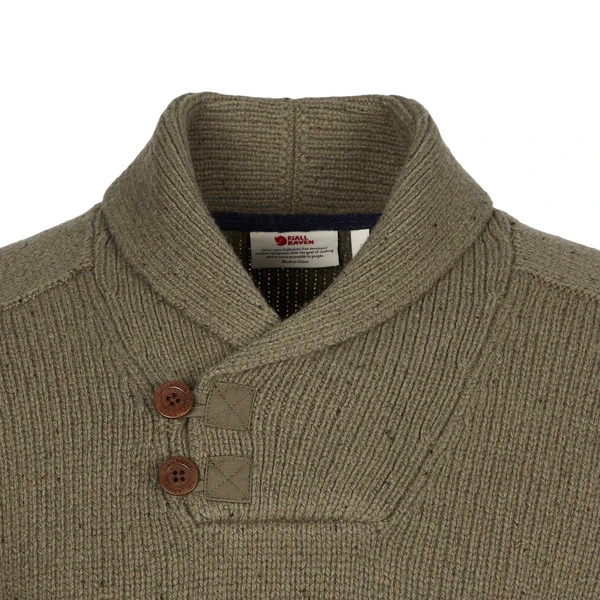 Der Lada Sweater ist ein klassischer Strickpullover aus weichem Lammwollgemisch. Er hat einen schmeichelnden Schalkragen, der vorne mit zwei Knöpfen aus Steinnuss geschlossen wird.