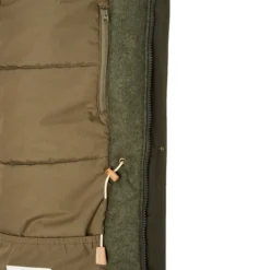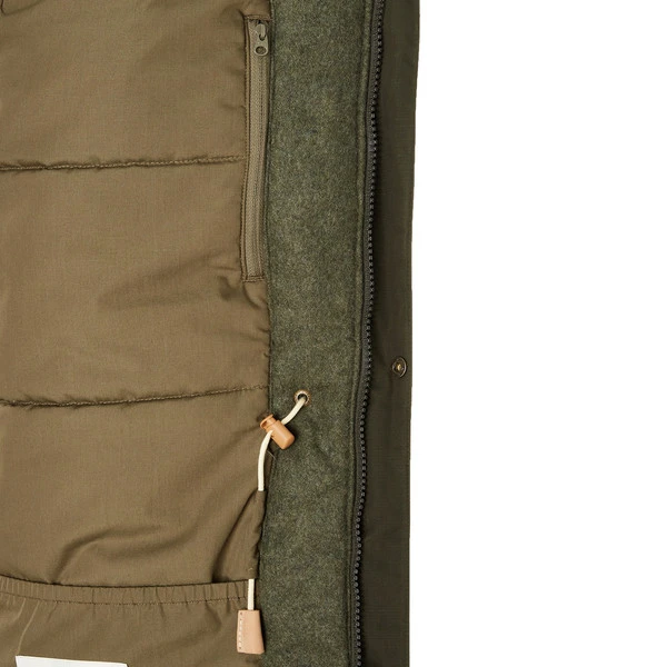 Die Füllung besteht aus nachwachsenden Rohstoffen, und zwar aus Lavalan, einem Gemisch aus Wolle und Polylactid, das aus Maisstärke gewonnen wurde. Das Füllmaterial sorgt selbst an eiskalten Tagen für wohlige Wärme und kann dabei mit feuchtigkeitsleitenden und atmungsaktiven Eigenschaften aufwarten. Dadurch gerätst du nicht so schnell ins Schwitzen, wenn du zum x-ten mal den Schlitten mitsamt deinen Kindern den Berg heraufziehen musst. Durch die natürliche Geruchsresistenz der Wolle nimmt der Parka zudem nur sehr langsam unangenehme Gerüche an und braucht nur selten gewaschen zu werden.