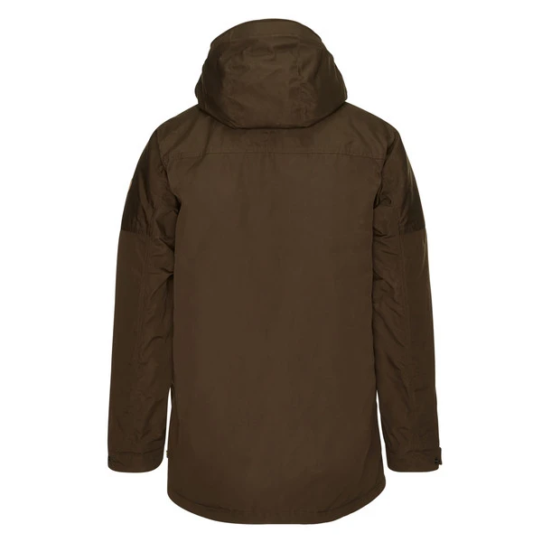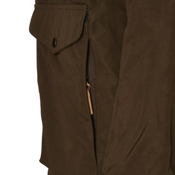 Das Außenmaterial besteht aus G-1000 Eco, einer atmungsaktiven und strapazierfähigen Mischung aus recyceltem Polyester und Bio-Baumwolle. Das Material ist wasserabweisend mit Greenland Wax imprägniert. Dadurch hält die Jacke auch mal einem kleinen Regen- oder Schneeschauer stand, ohne dass sich das Material sofort mit Nässe vollsaugt.