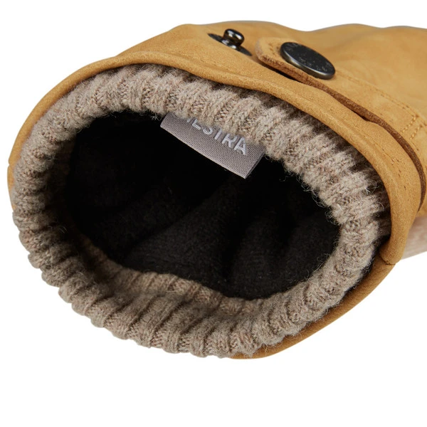 Durch das Leder hast du einen guten Grip, ob am Trekkingstock oder auf dem Fahrrad. Der Rippstrick-Einsatz am Saum schließt gut. Und durch den Druckknopf am Handgelenk kannst du die Weite anpassen. So wird der Sitz optimiert und obendrein kalter Wind abgehalten, in den Handschuh zu gelangen.