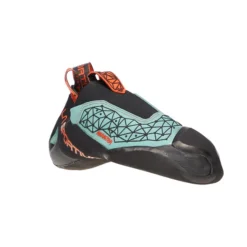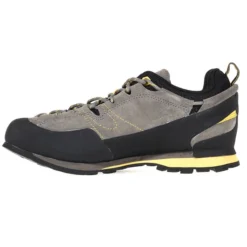 Innen komfortabel gepolstert und mit feuchtigkeitsleitendem Mesh versehen. Die eher flach gearbeitete Sohlenkonstruktion setzt sich aus mehreren, dämpfenden EVA-Lagen und profiliertem Gummi (Vibram) zusammen. Die profillos gearbeitete Spitze der Laufsohle sorgt für angemessenen Grip am Fels. Geschlossen wird der Schuh mit einem tief angesetzten, komplett umlaufenden Schnürzug, mit dem sich Form und Sitz optimal anpassen lassen.