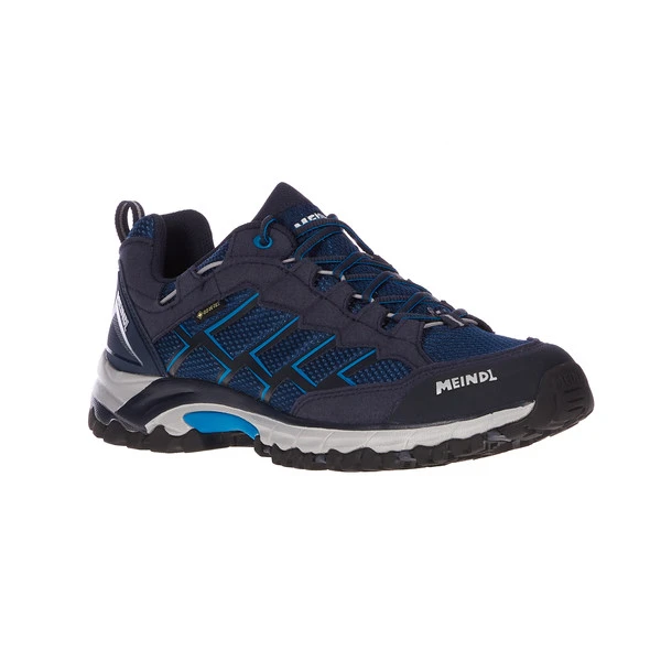 Der Halbschuh ist aus leichten Synthetikmaterialien gefertigt, das partiell mit Veloursleder verstärkt wird. Fersenbereich und Schuhspitze sind zusätzlich mit stabilen Kappen aus Gummi, bzw. Kunststoff geschützt. Regenwetter macht dem Schuh auch nichts aus, denn eine Gore-Tex Membran macht ihn zuverlässig wasserdicht und obendrein atmungsaktiv. Auch wird durch die Membran ein vernünftiger Feuchtigkeitsaustausch gewährleistet und das Fußklima angenehm reguliert.