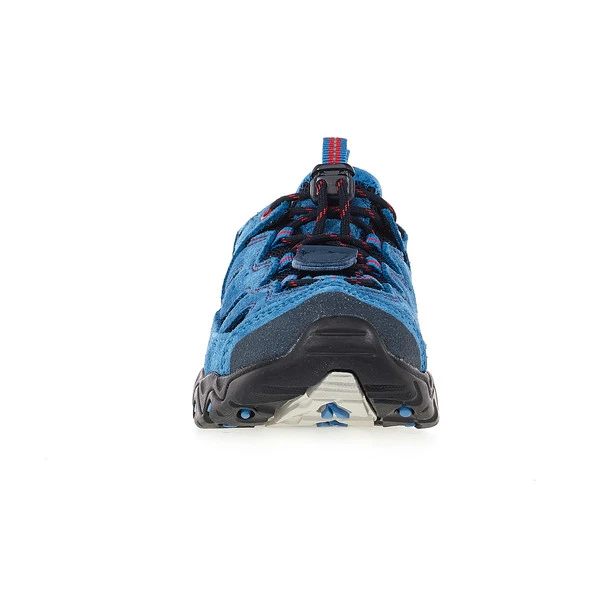 So steckt der Kinderfuß im Rudy Junior von Meindl. Wo außen strapazierfähiges Veloursleder mit Nylonmesh kombiniert ist, zeigt sich innen weiches, feuchtigkeitsleitendes Synthetikgewebe. Eine Materialkombination, die den Schuh rundum robust macht und dem Fuß ein angenehm ausgeglichenes Fußklima bietet. Der Fersenbereich ist weich gepolstert und lässt sich per Klettriemen optimal an die Fußform anpassen. Ein Schnellschnürzug über dem Spann ermöglicht die Regulierung der Weite.