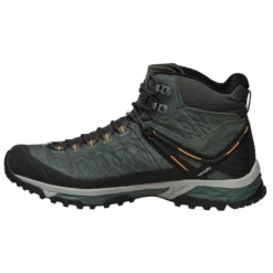 Beim Obermaterial kommen Velours- und Nubukleder zum Einsatz, das an den Zehen und an der Ferse zusätzlich durch einen schützenden Gummirand verstärkt wird. Innen ist der leichte Schnürer mit Textilfutter ausgestattet, eine Gore-Tex Membran sorgt dafür, dass die Füße trocken bleiben. Der Abschluss des Schafts wurde für ein besonders angenehmes Tragegefühl mit Leder abgefüttert und weich gepolstert. Neben der stabilen und gut gedämpften Sohlenkonstruktion leistet auch das dämpfende Softstep-Fußbett mit Lederoberfläche seinen Beitrag zum hohen Komfort des Top Trail Mid GTX.