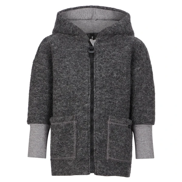 Die angenehm leichte, weiche Jacke ist komplett aus nachwachsenden Naturfasern hergestellt, und zwar aus weicher Schurwolle und Bio-Baumwolle. Dank der Schurwolle wirkt die Jacke temperaturausgleichend. So bleiben die Kinder an kühlen Herbst- und Frühjahrstagen angenehm warm, sie überhitzen aber auch nicht, wenn sie sich viel bewegen. Zudem wirkt Wolle feuchtigkeitsleitend und wärmt auch dann noch, wenn sie im Regen einmal feucht geworden ist. Der Anteil an Bio-Baumwolle sorgt für einen besonders weichen Griff. Durch das gewalkte Material hält die Jacke schön warm und ist außerdem recht strapazierfähig.