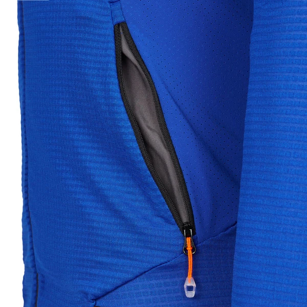 Die Jacke besteht aus wärmeregulierendem, schnelltrocknendem Polarlite Grid-Fleece. Die Waffelstruktur auf der Innenseite sorgt für einen sehr schnellen Abtransport von Körperfeuchtigkeit. Außerdem ermöglicht die Struktur eine hohe Wärmeleistung bei einem gleichzeitig geringen Gewicht. Am Rücken befindet sich ein Einsatz aus einem leichten Softshell-Gewebe mit luftiger Lochstruktur, die den Tragekomfort bei schweißtreibenden Aktivitäten noch einmal erhöht. Das stark elastische Material macht auch sportlichste Bewegungen mühelos mit, ob auf dem Trail oder direkt am Berg.